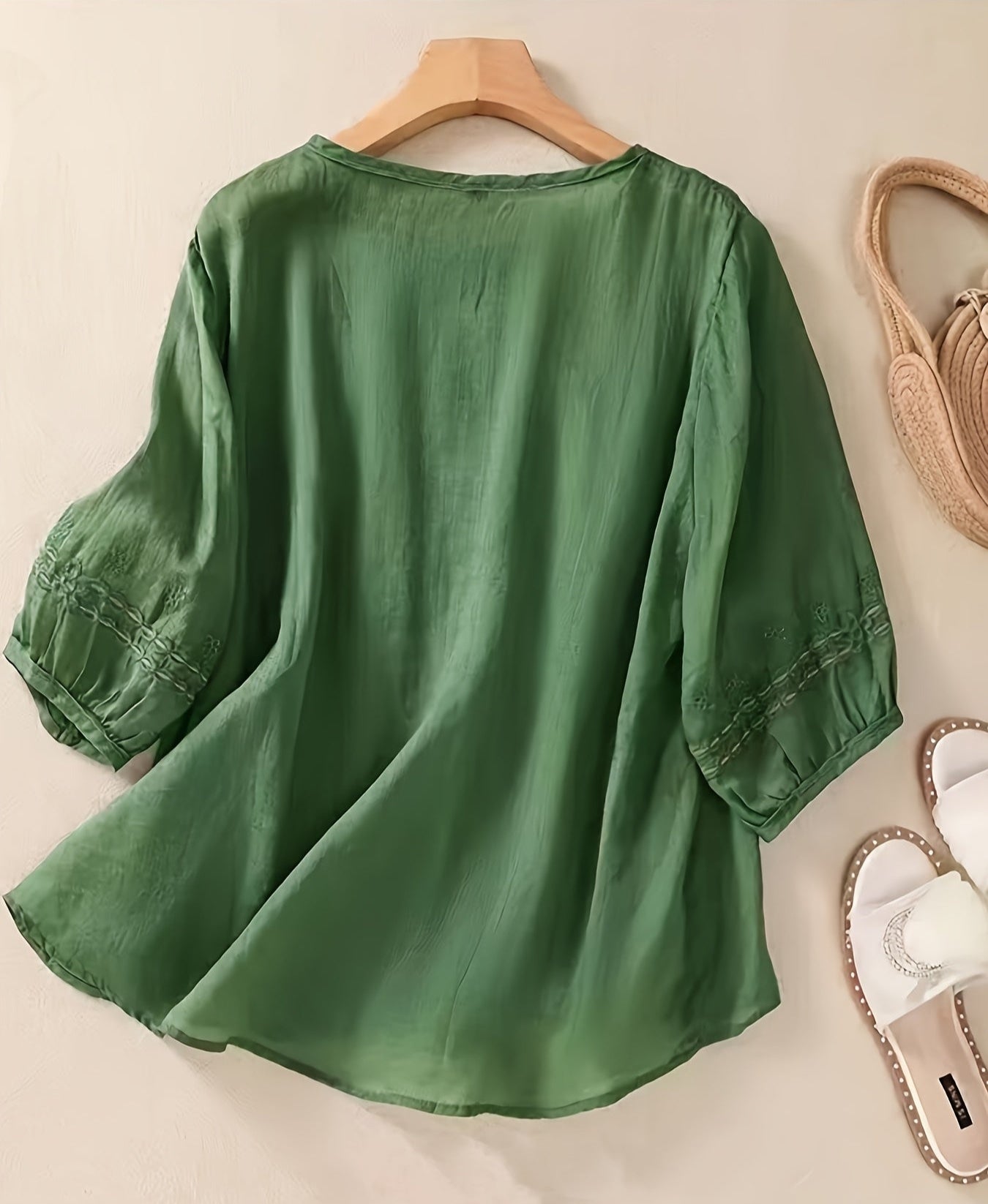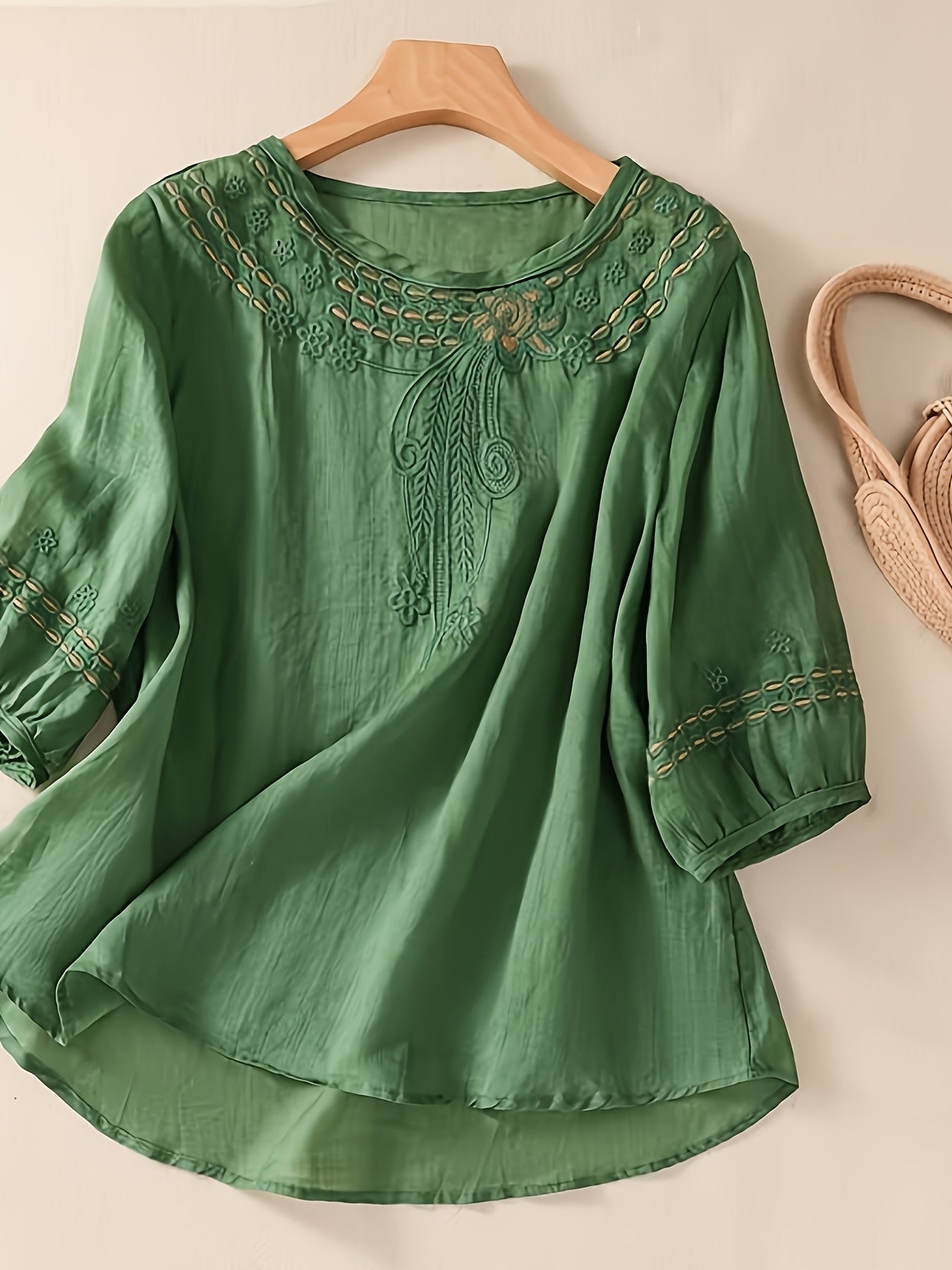 Breathe elegance into your everyday with this delicately embroidered cotton-linen blouse. Crafted from a breezy, featherlight cotton-linen blend, it offers softness and breathability with a graceful drape that flatters every silhouette. The eye-catching embroidery and openwork detailing along the neckline and sleeves infuse the piece with bohemian artistry.