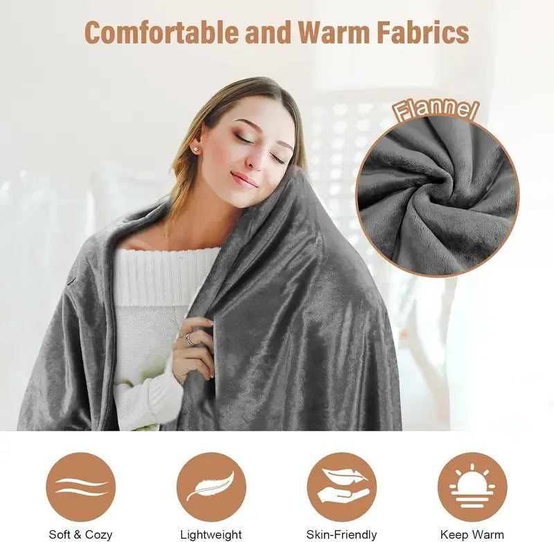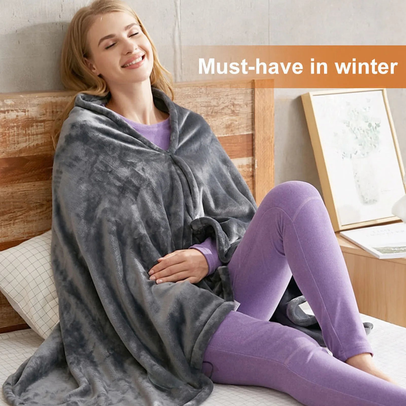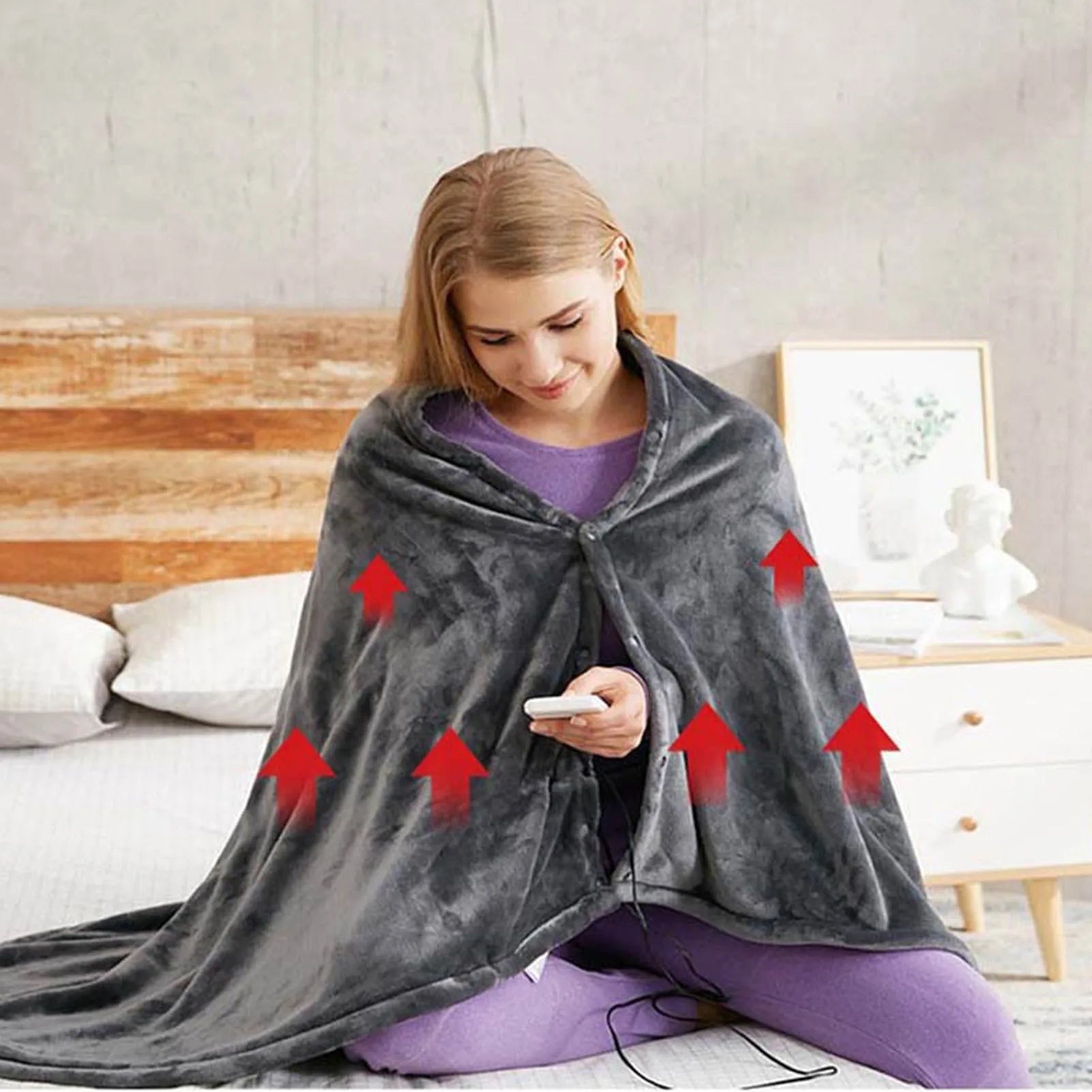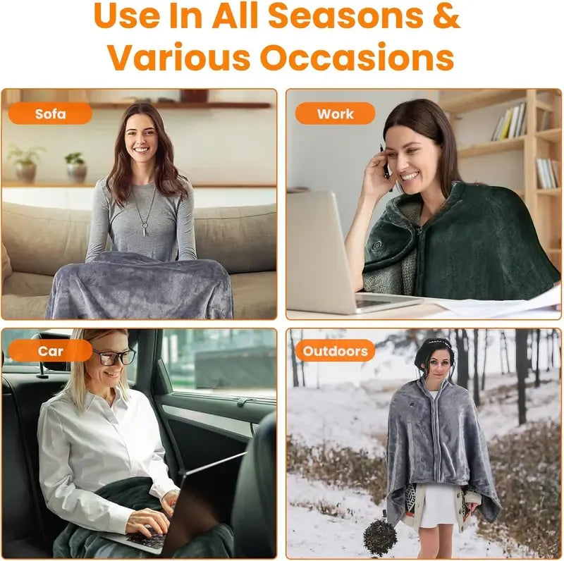 Wrap in instant warmth at home, at your desk, in the car, or by the campfire. This plush flannel wearable blanket snaps at the neck and delivers soothing, even heat across your shoulders, back, and lap—powered by any USB power bank or adapter.