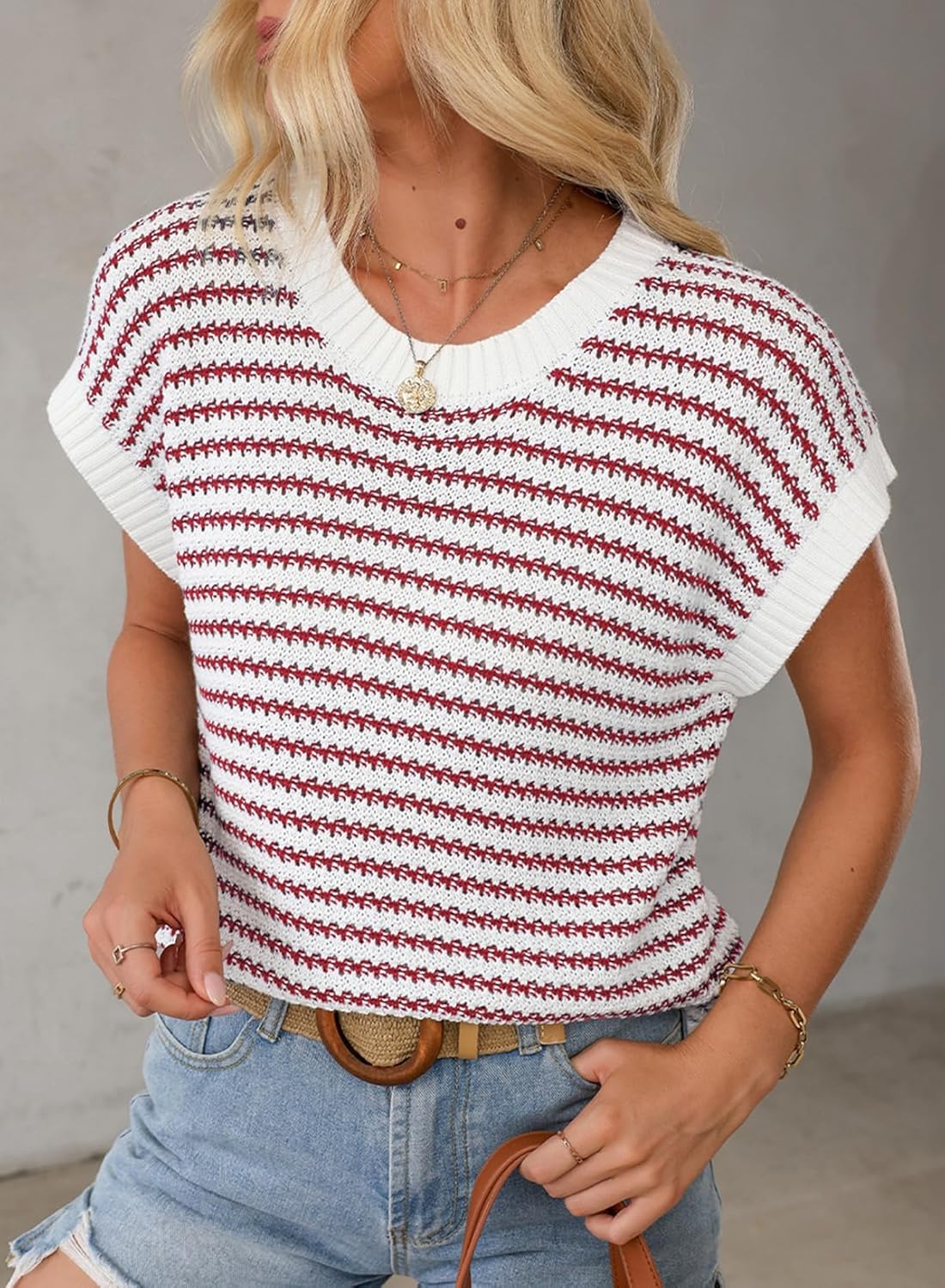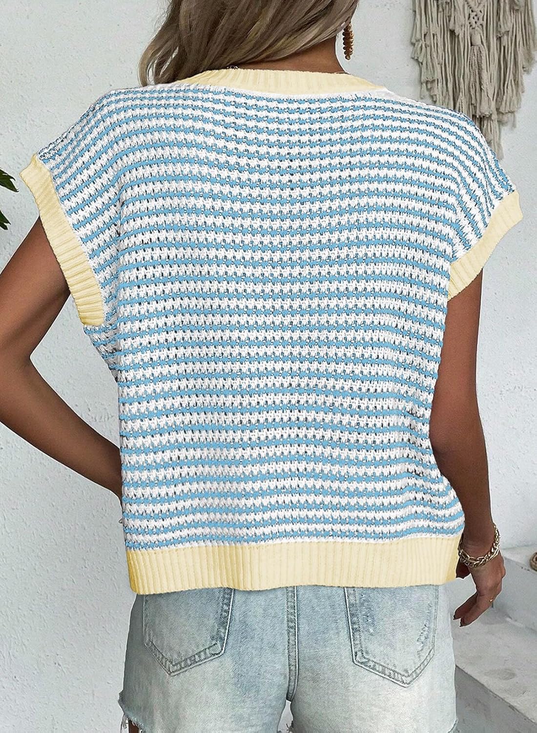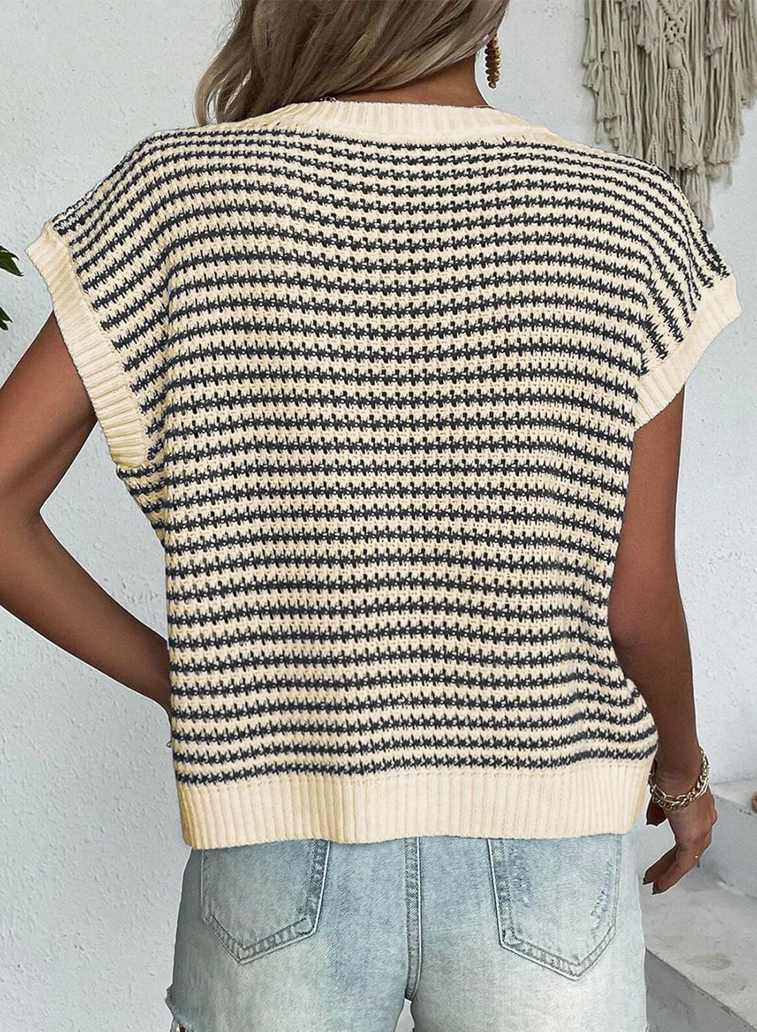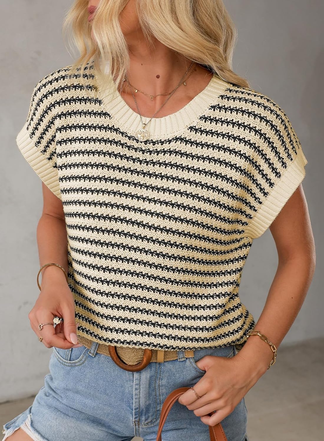 A breezy sweater tank with textured stripes and ribbed trim. The cap sleeves and relaxed, boxy fit make it an easy throw-on for warm days or layered looks.