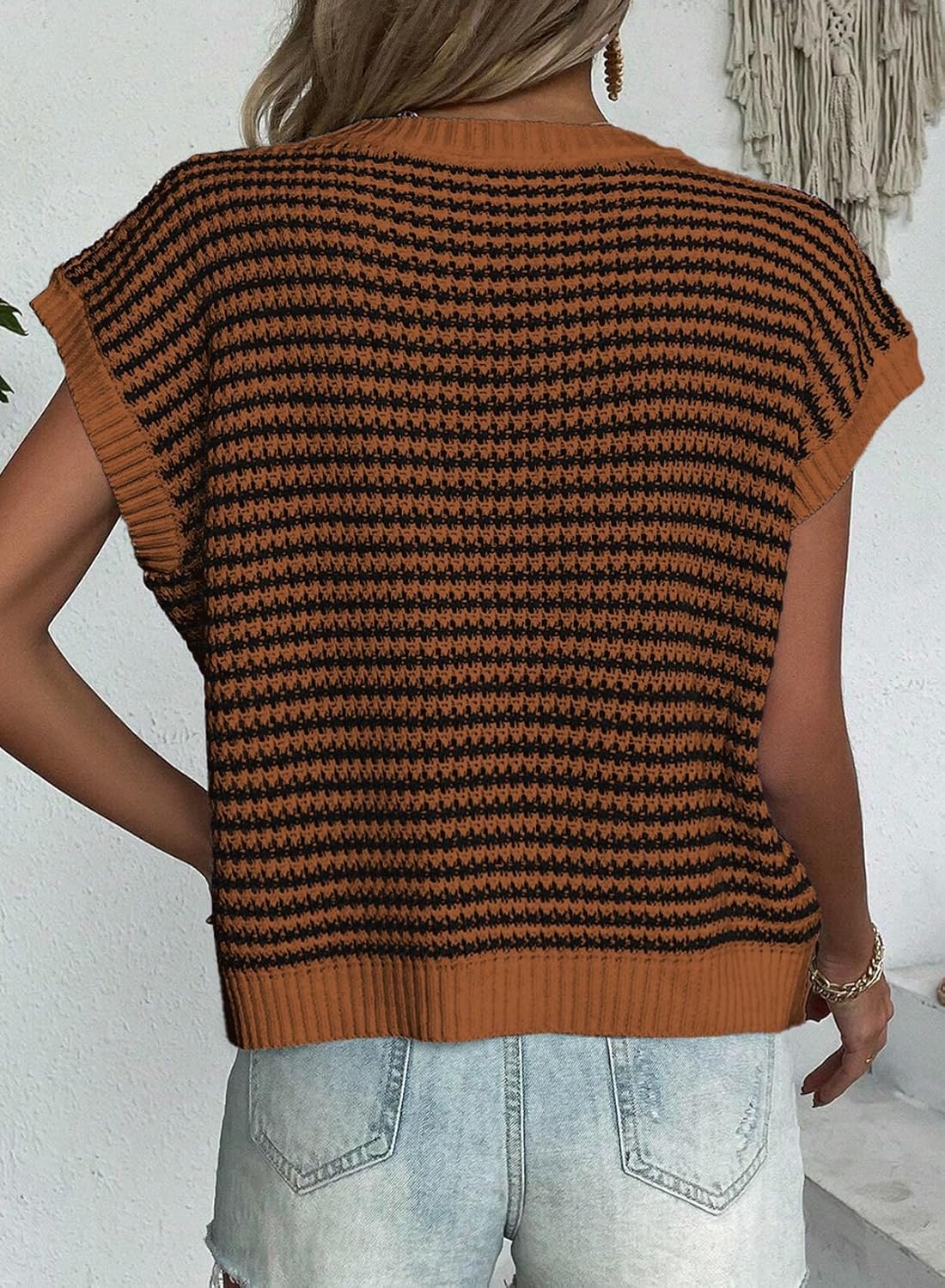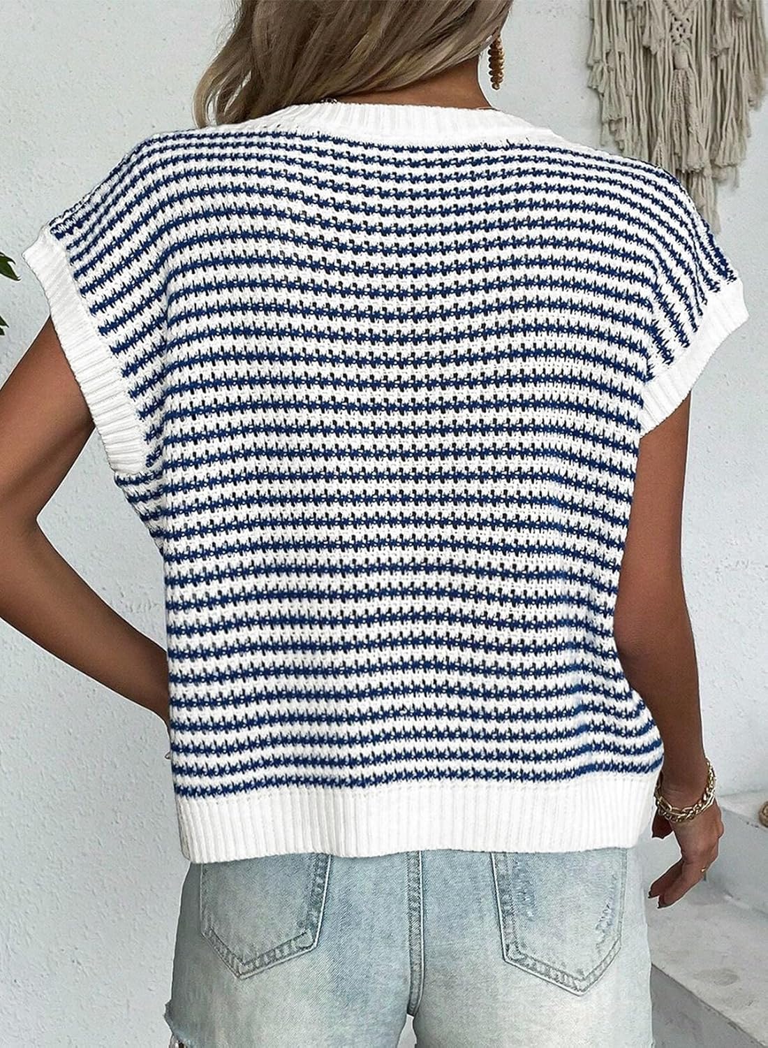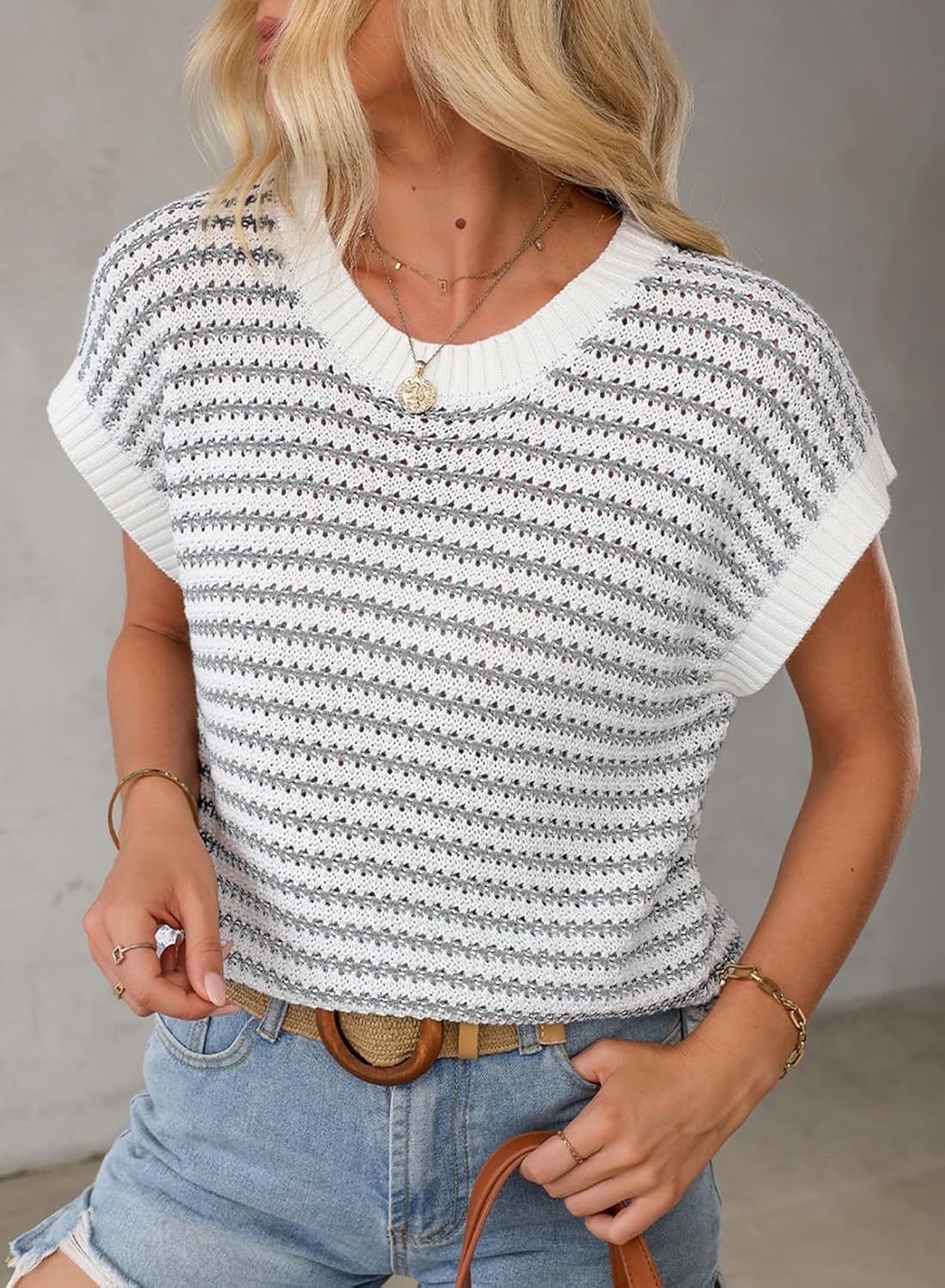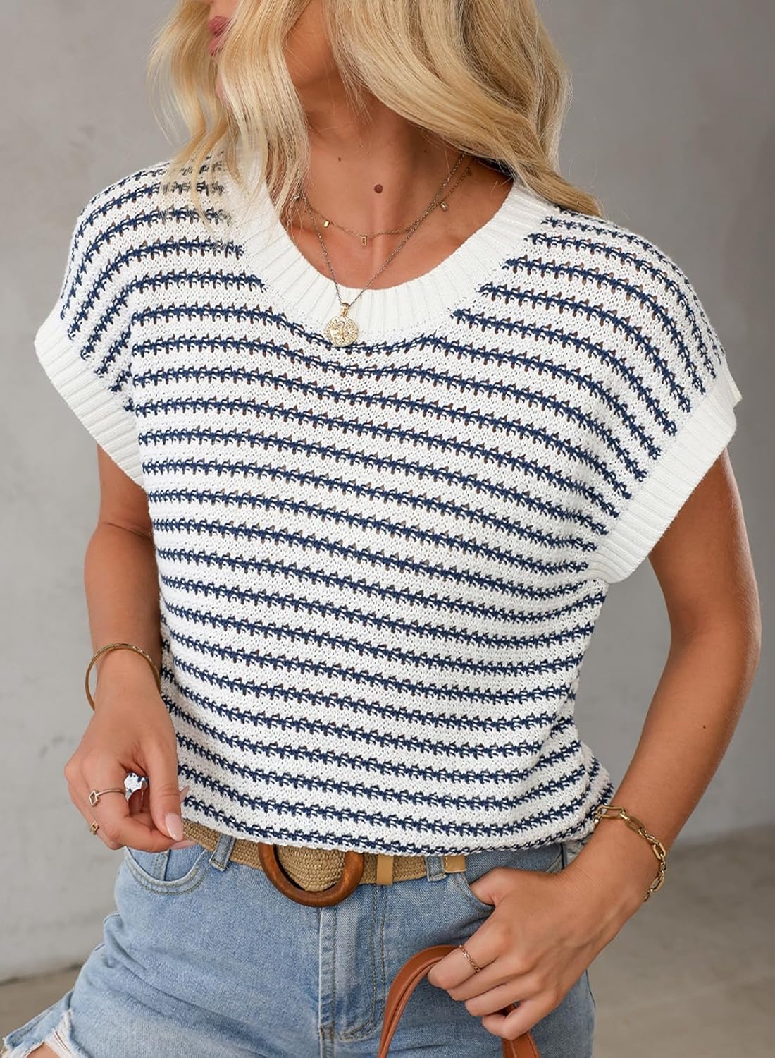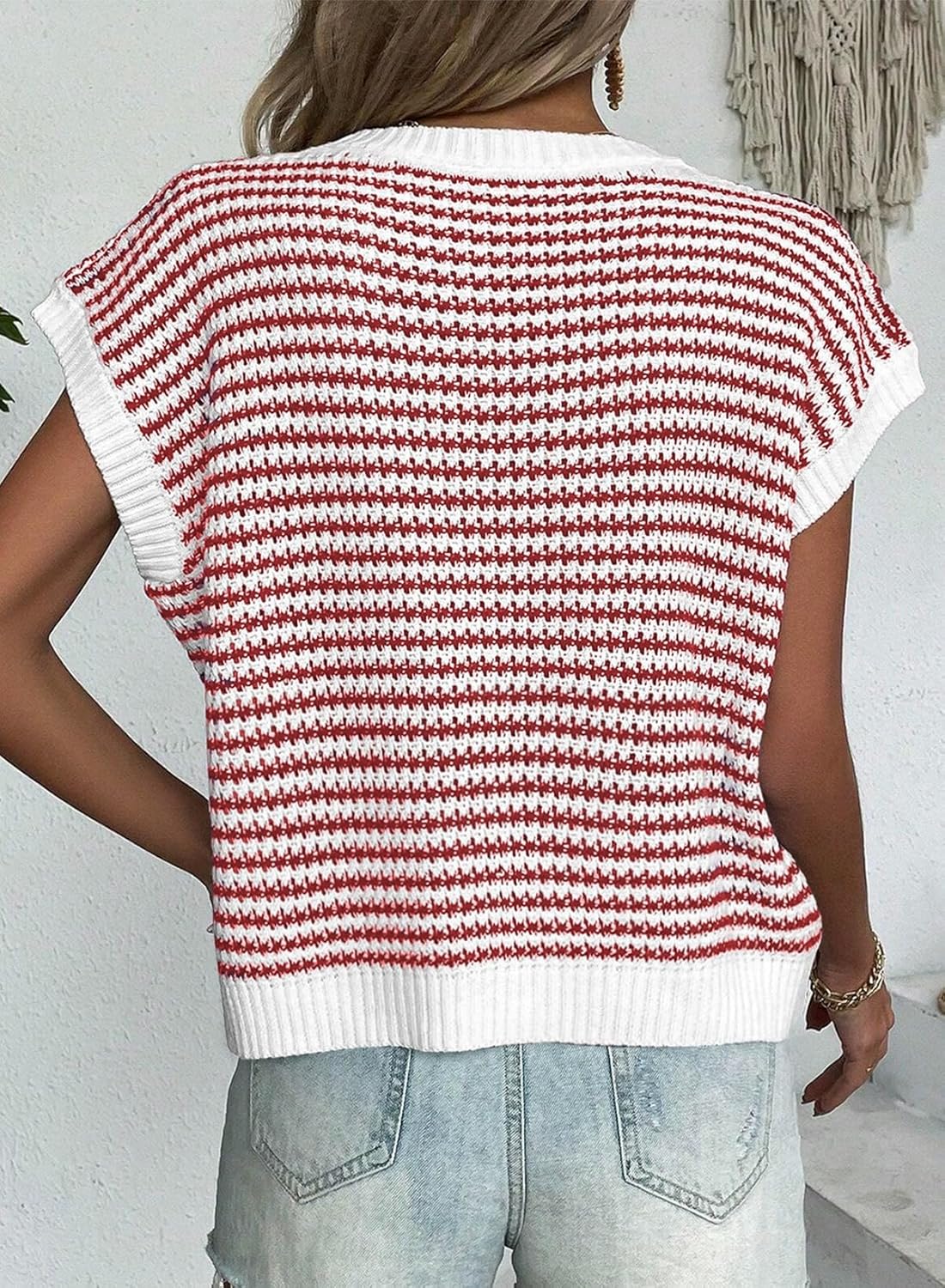 A breezy sweater tank with textured stripes and ribbed trim. The cap sleeves and relaxed, boxy fit make it an easy throw-on for warm days or layered looks.