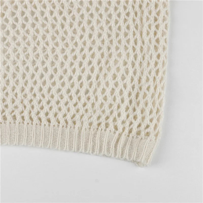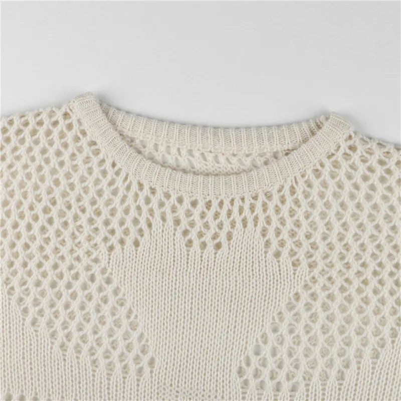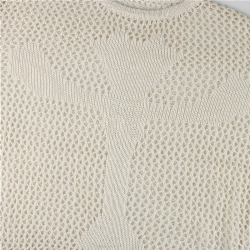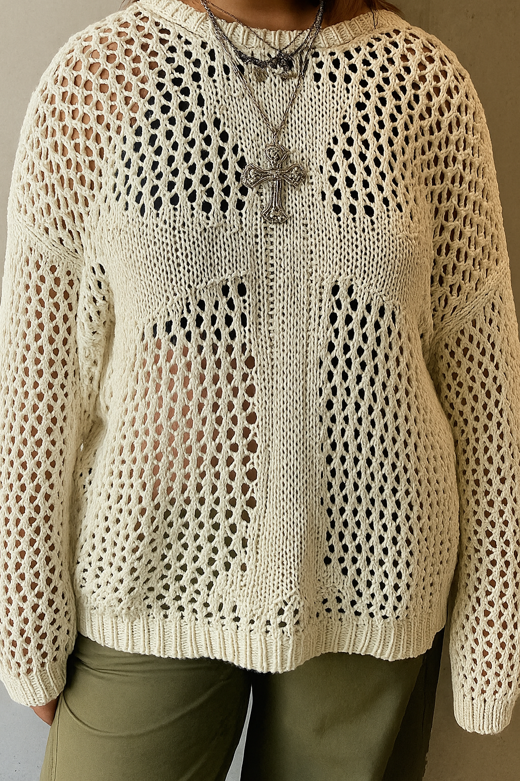 Make your layers pop with this airy open-knit pullover, designed with mixed-stitch panels that form a bold cross at the front. The sheer mesh texture, relaxed drape, and ribbed trims keep it easy and effortless—perfect over a cami, bandeau, or bralette. Soft, breathable, and statement-ready for year-round styling.