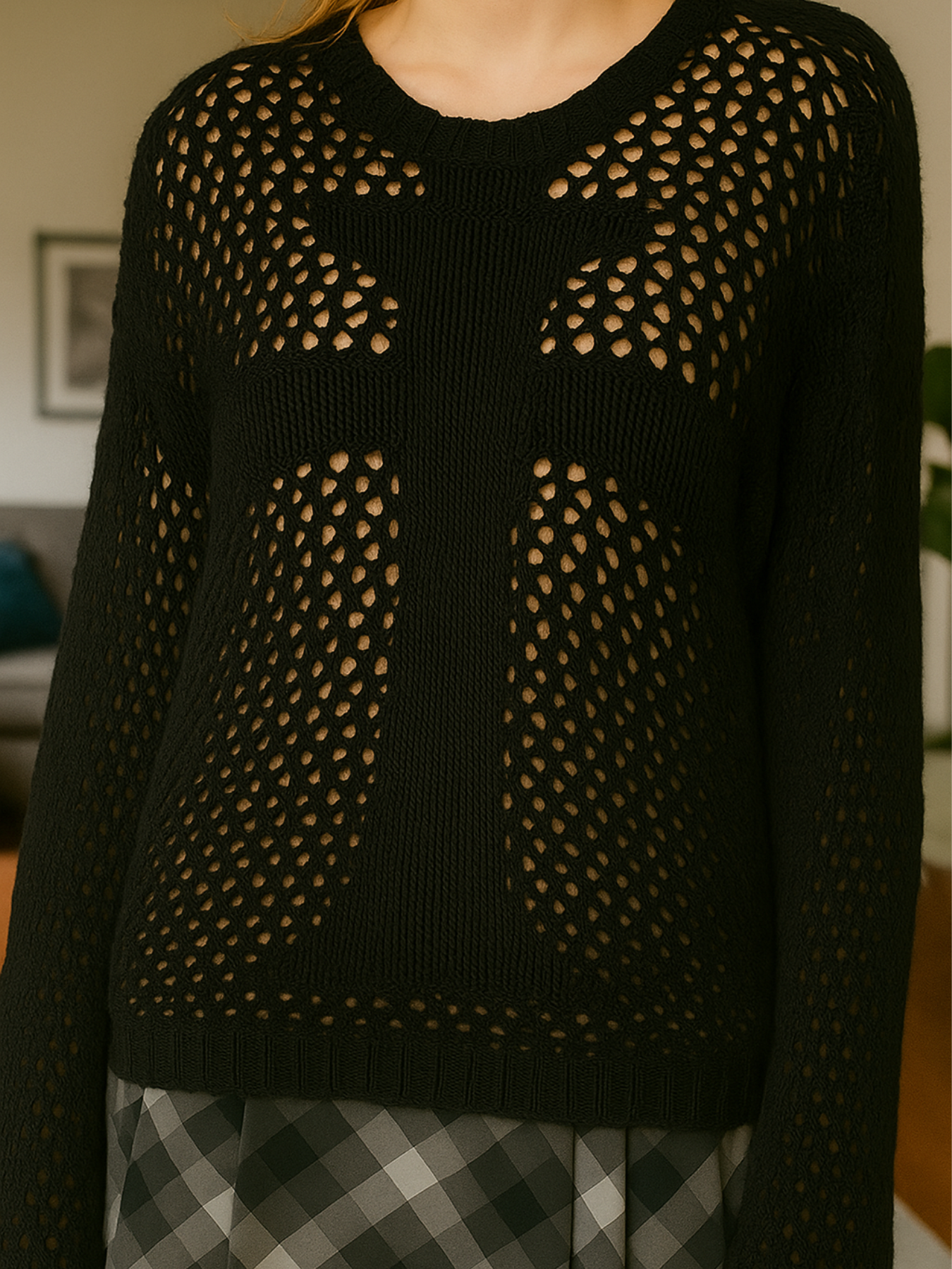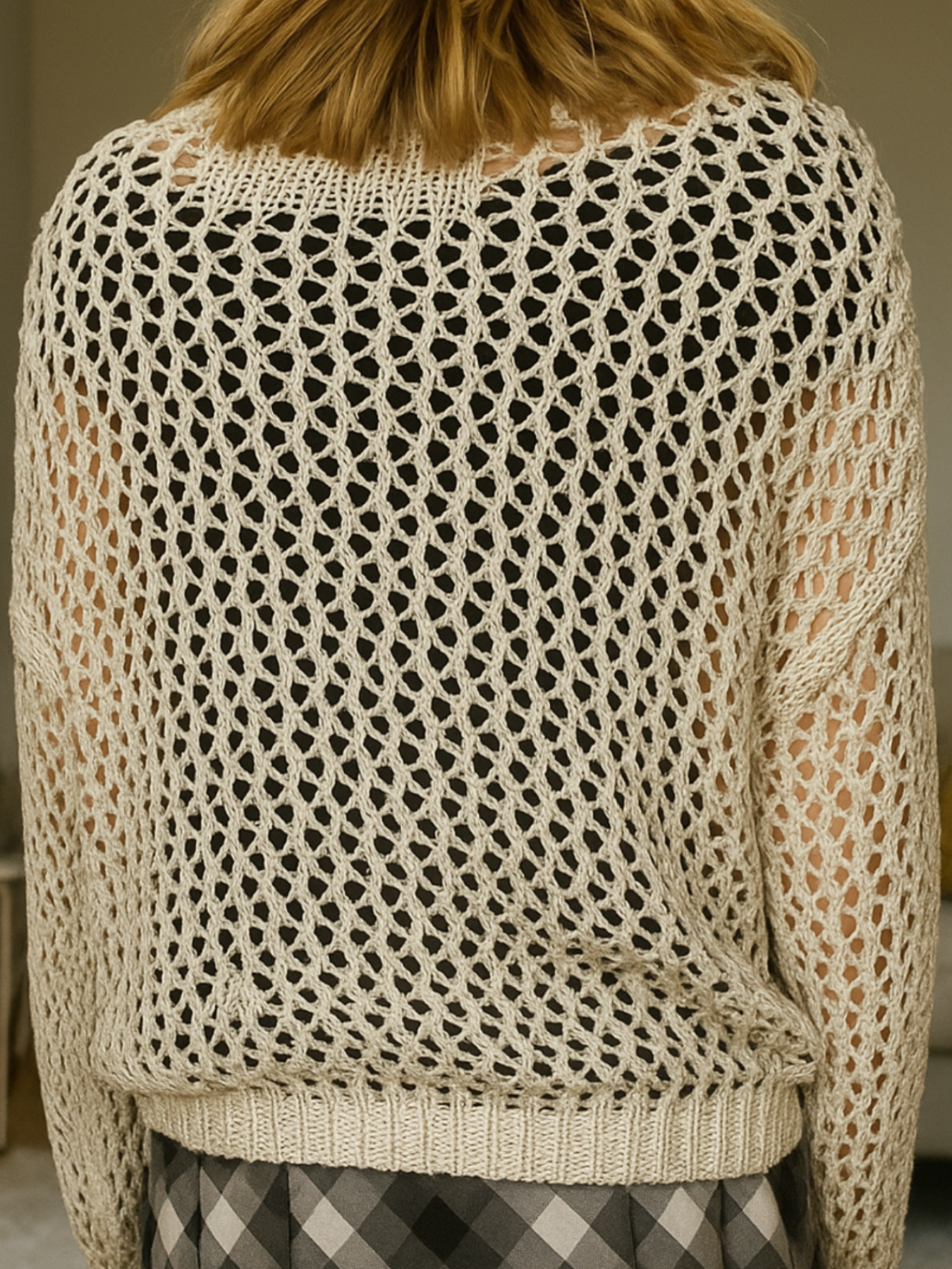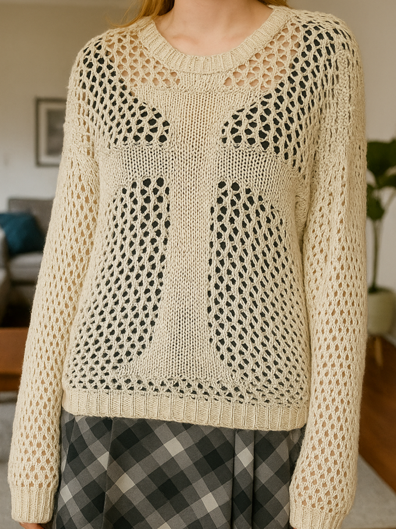 Make your layers pop with this airy open-knit pullover, designed with mixed-stitch panels that form a bold cross at the front. The sheer mesh texture, relaxed drape, and ribbed trims keep it easy and effortless—perfect over a cami, bandeau, or bralette. Soft, breathable, and statement-ready for year-round styling.